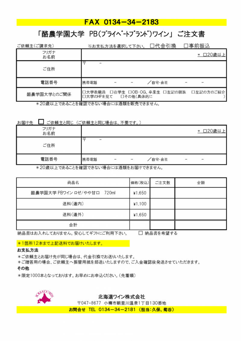 - 限定1,000本となっています。昨年から、酪農学園大学関係者(卒業生、親族を含む)以外でも購入可能となりました。