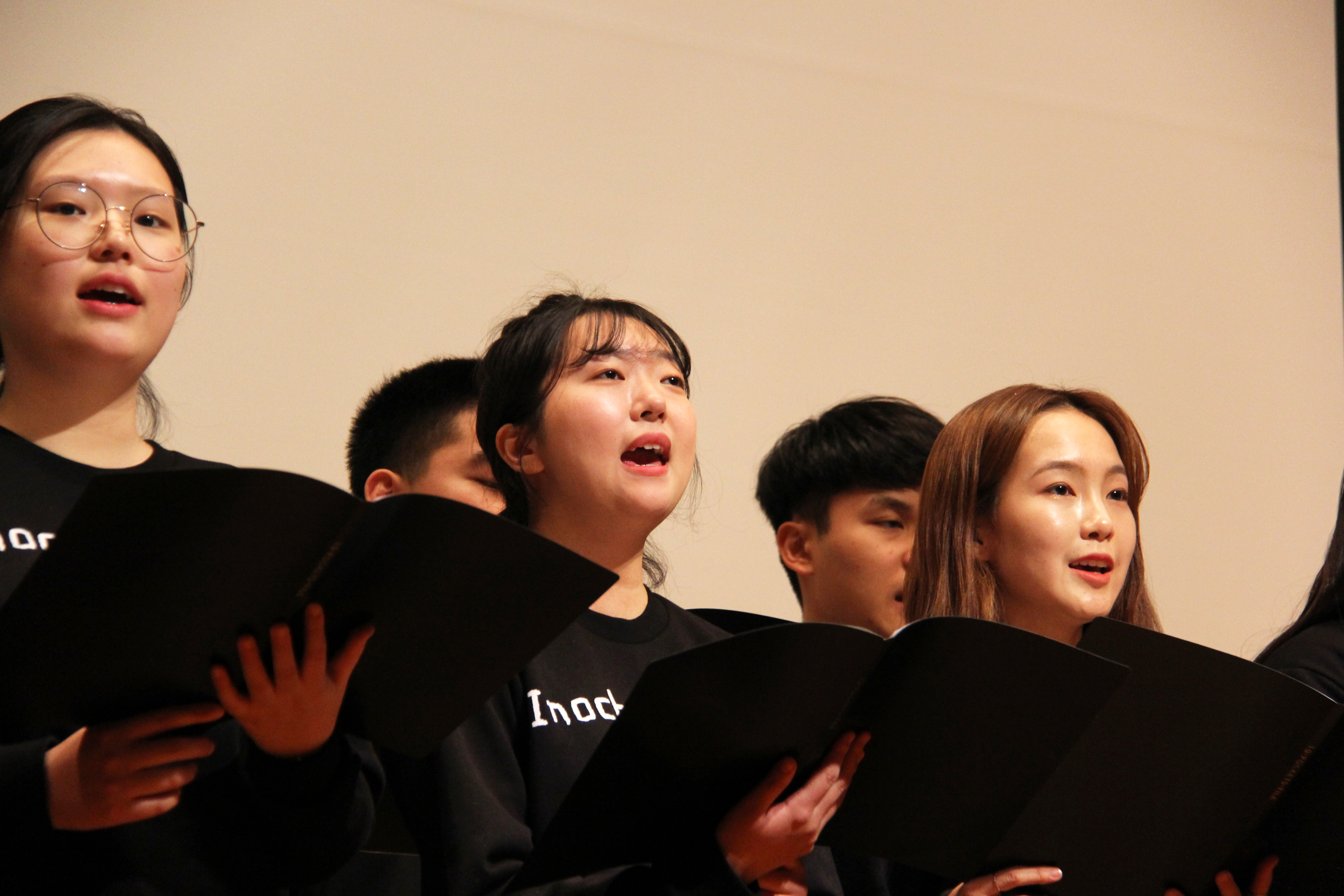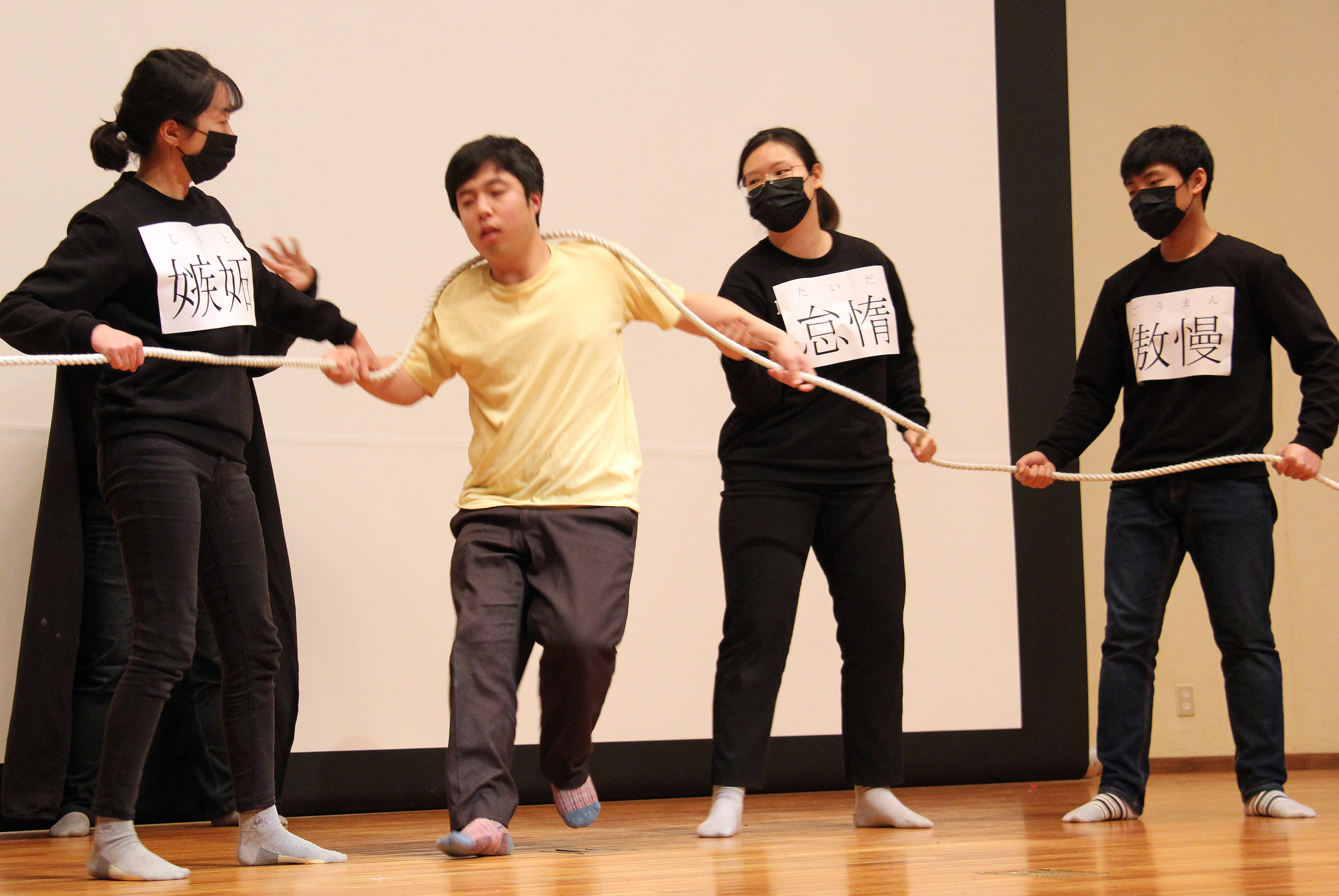 CCC(Campus Crusade for Christ)は、1951 年にアメリカで創設された学生による宣教団体で、世界の190 にも及ぶ国や地域で活動をしています。今回は韓国の忠南大学、ハンバツ大学、培材大学から18 名の学生が来学し、礼拝の中の祈りとして踊りや歌を披露しました。