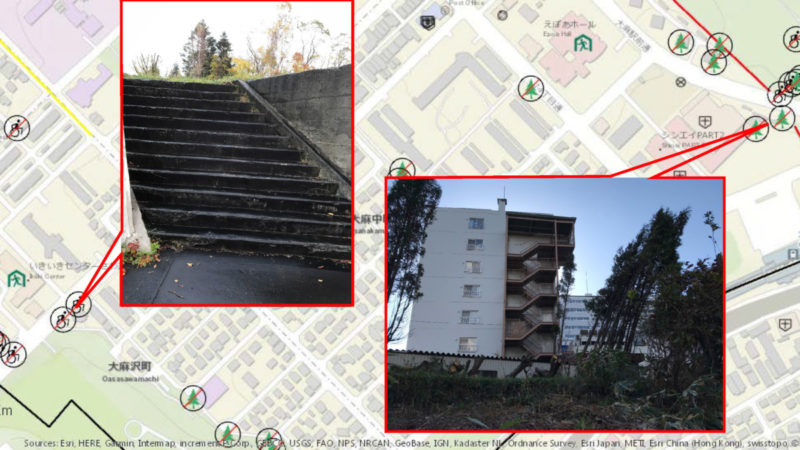 車椅子を使っている人や高齢者が取り残されないよう、バリアフリー情報を加え、範囲をもっと細かくするため、試験調査地に大麻小学校区を取り上げ、実際に歩いてどこに何かあるかまちの情報を調査しました。そうすることで、個々が避難行動を考え、防災意識を高められると考えました。