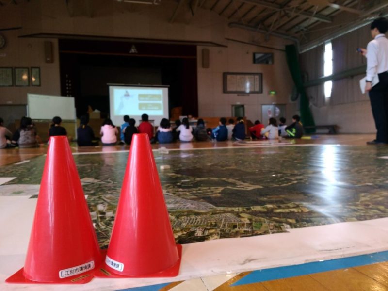 研究室では、2009年から江別市内の小学校で、『巨大空中マップ』を使った環境教育の出前授業を行っています。9月に起きた北海道胆振東部地震を機に授業内容も変化し、地域のハザードマップがあまり効果的に活用されていないことに気付きました。