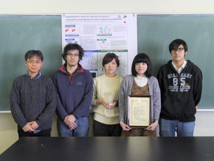 また、指導した北村教授は受賞にあたり「獣医生理学ユニットとしては、2年連続の受賞となり光栄に思っている。これまでにUSP2は男性不妊や肥満に係ることが明らかにできた。さらに研究を進め、この分子の臨床学的な役割を明らかにしていきたい」と述べました。また、橋本さんに対して「さらに研究を進めてほしい。さらなる研究発展をサポートしていきたい」と期待を寄せました。