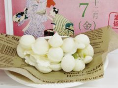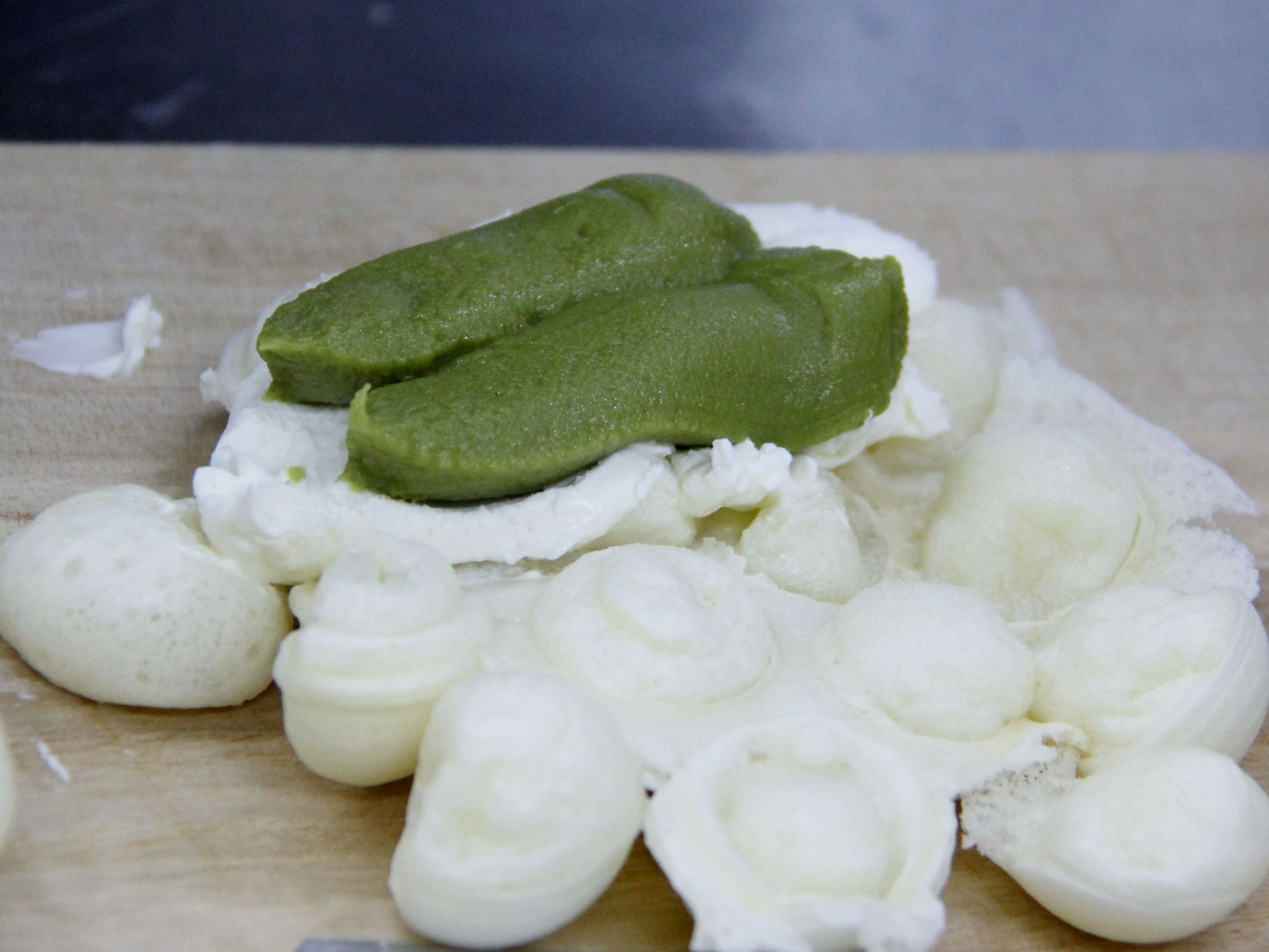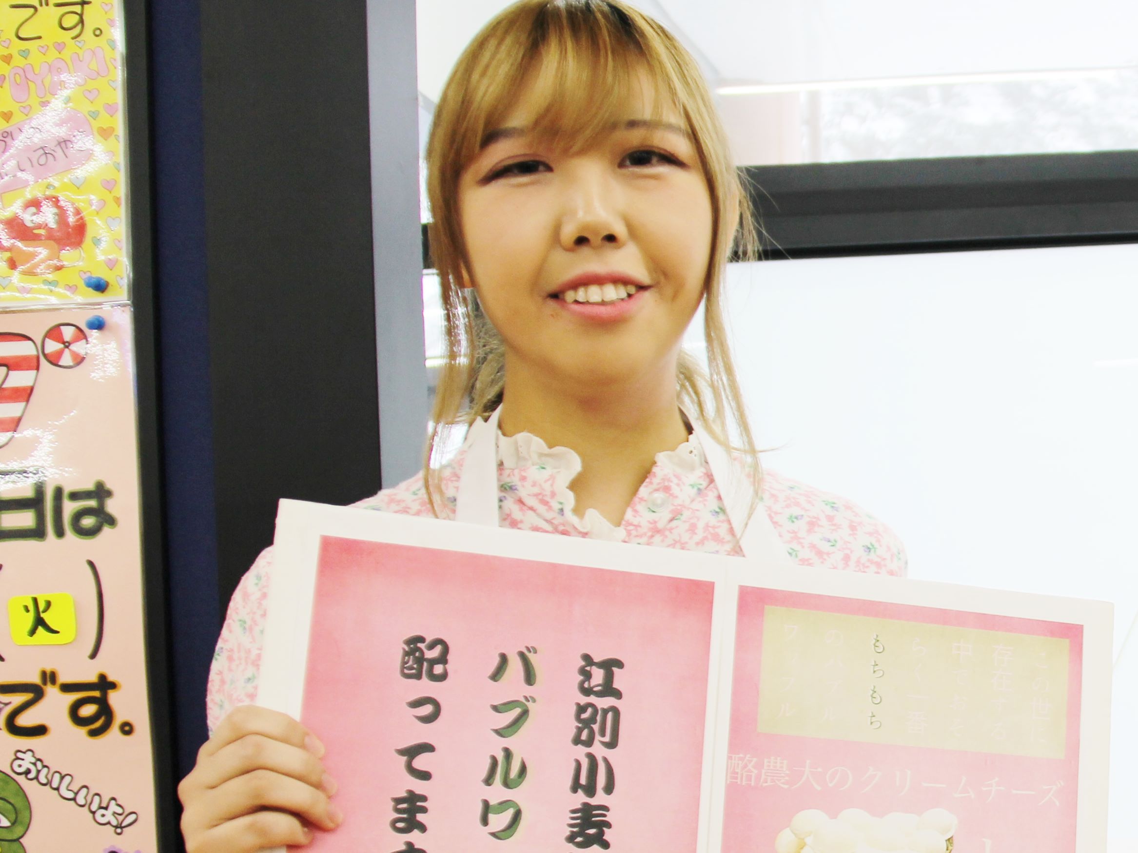 秋山さんは、江別産の小麦「ドルチェ」とタピオカ粉を合わせた生地をバブルワッフル専用のホットプレートで焼き、もちもちした食感のワッフルに仕上げました。中には、抹茶の生産地で有名な愛知県西尾市の”西尾抹茶クリーム”と本学のクリームチーズがサンドされ、和と洋の素材が融合したバブルワッフルを考案しました。