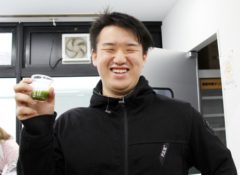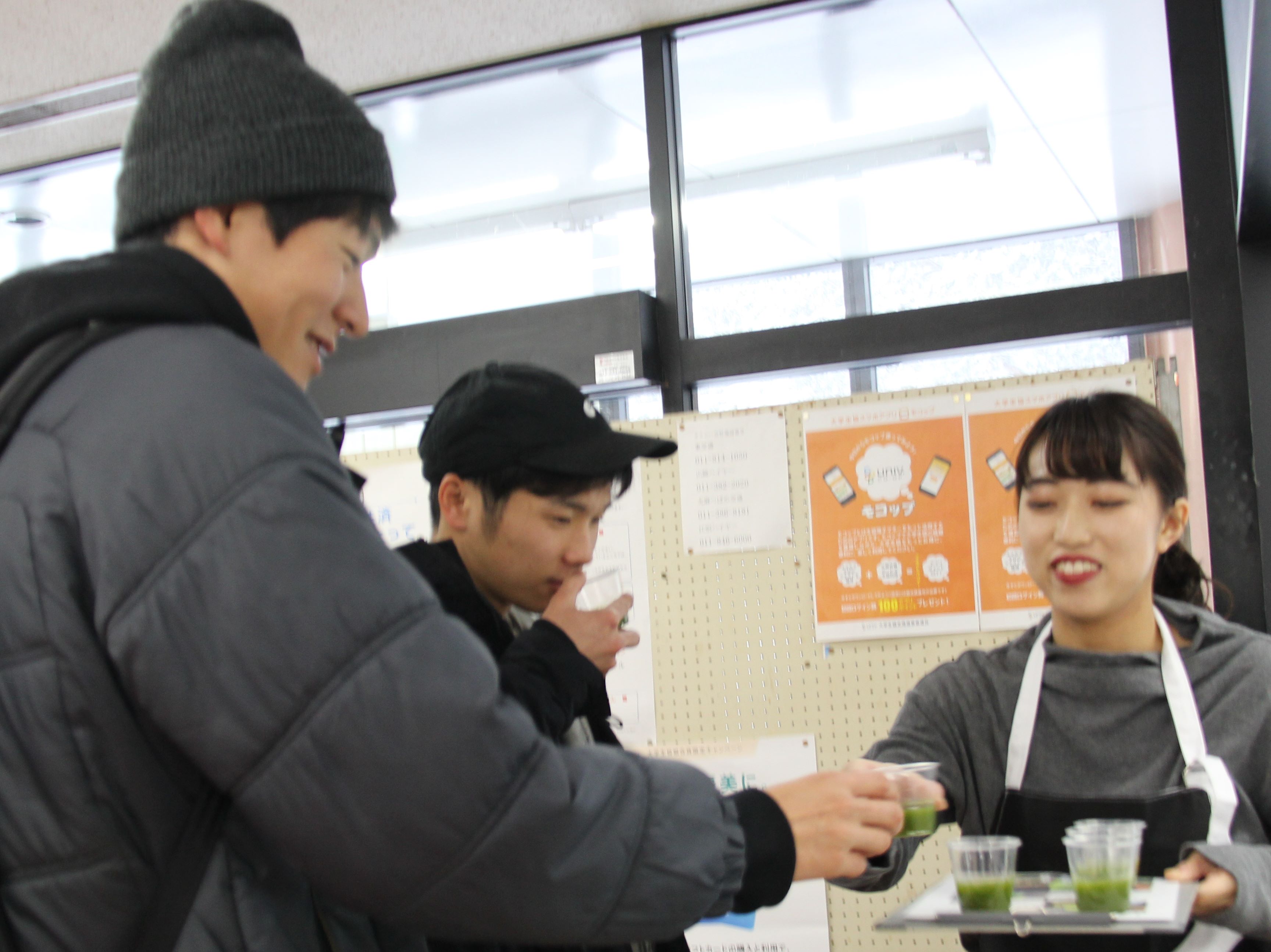 環境共生学類2年の青木究吾さんは、「筋トレをしてきたばかりだったので、ビタミンが取れて調度良かったです。スポーツをしているとタンパク質は意識的に取りますが、ビタミンが不足しがちになります。その点このレタスレモンティーは、飲みやすくて栄養バランスも良いので、アスリート向けの飲み物にぴったりだと思いました」と話しました。