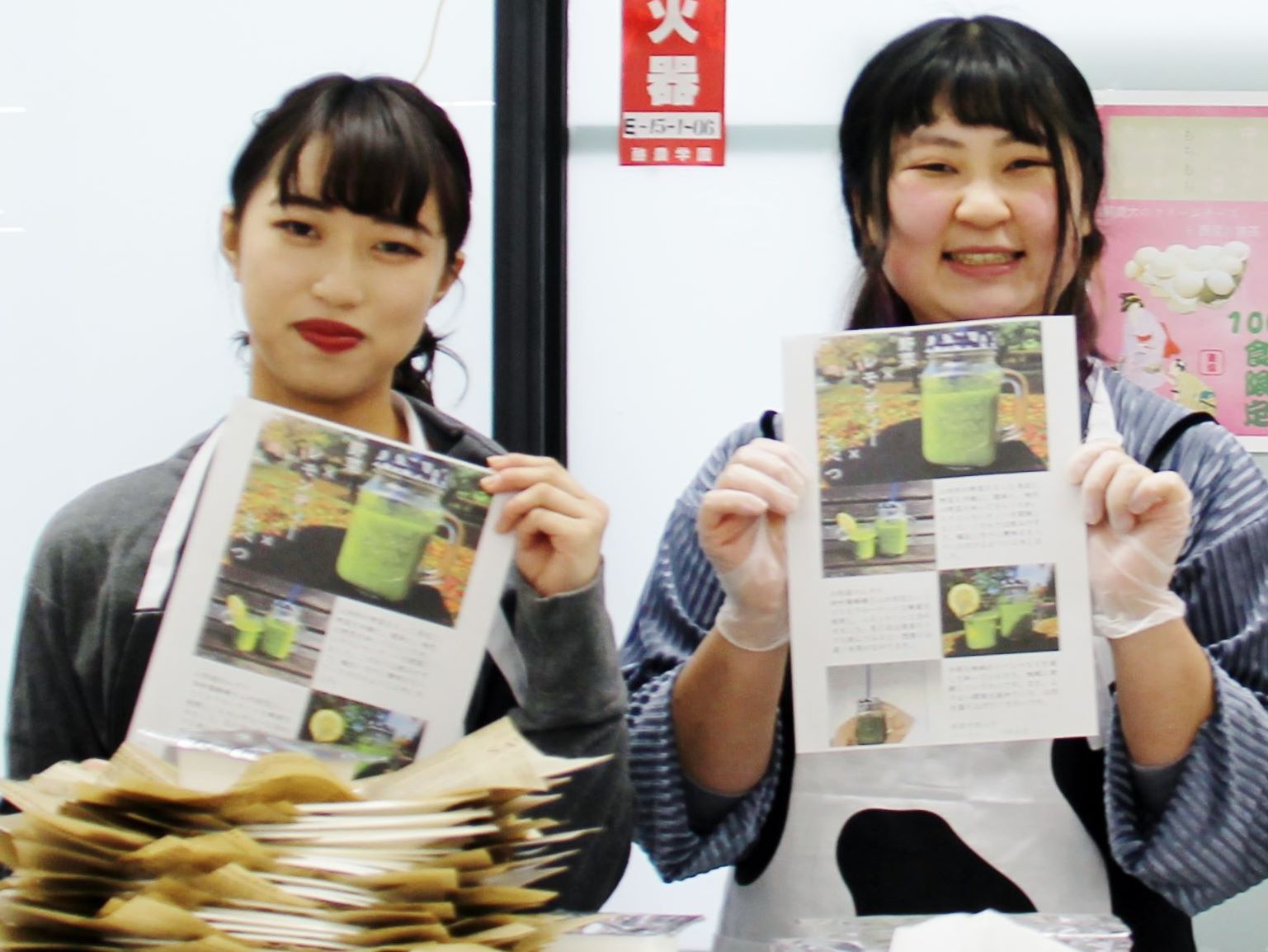 食と健康学類マーケティング研究室3年の秋山緋更さんは『バブルワッフル』を、佐藤美紀さんと松永朋恵さんは『レタスレモンティー』を考案し、12月7日(金)11時30分より、本学の生協1階のキッチンカウンターにて、約100食分の試食を提供しました。
