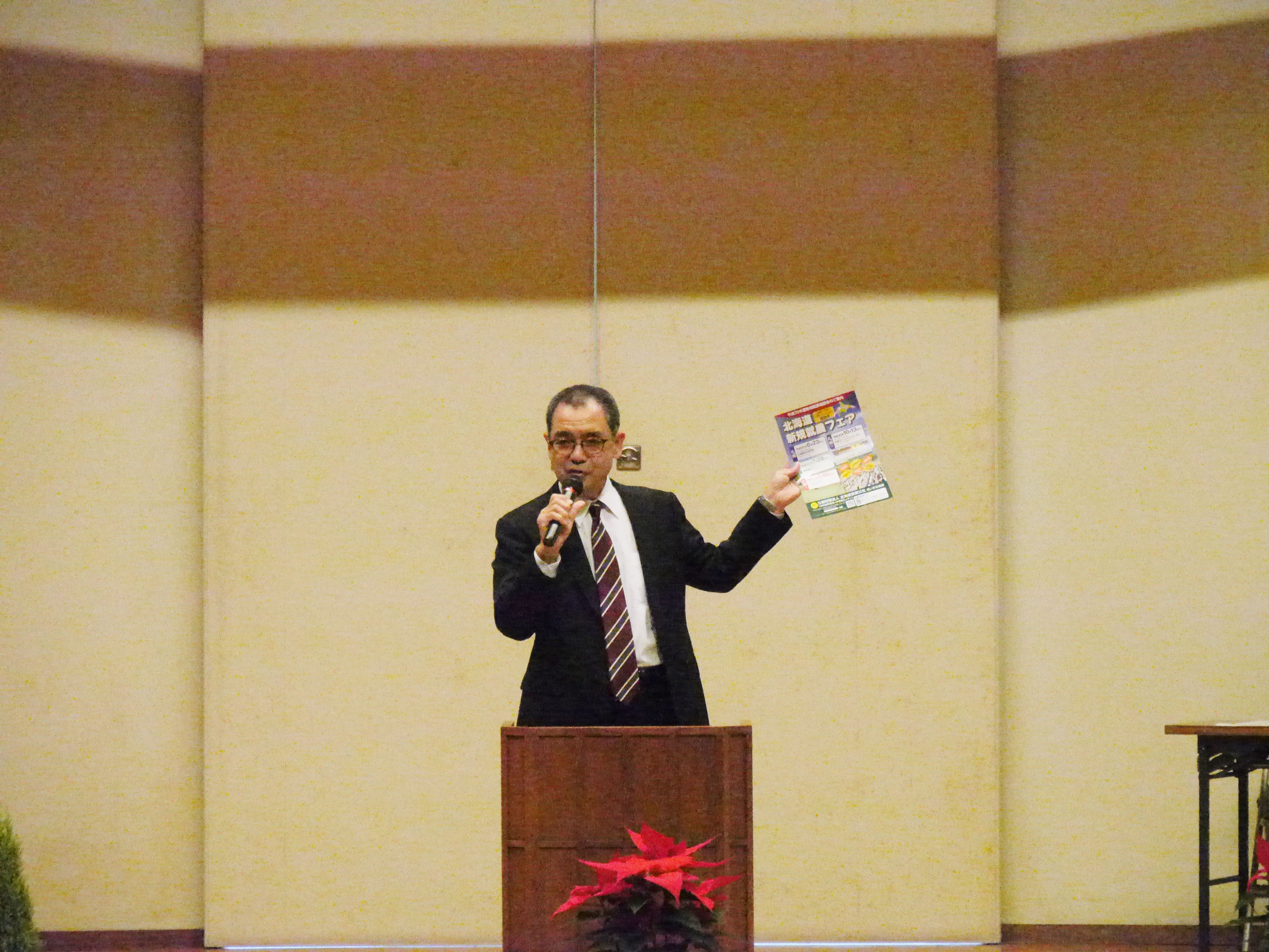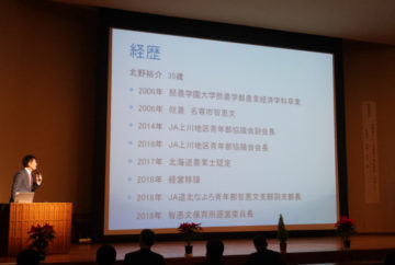 名寄市で畑作を営む卒業生の北野裕介さんが「後継者として名寄市の畑作農家に就農して」と題して講演したのち、市町村とJAによる新規就農のアピール、北海道農業公社や農業委員会からの参加者とのパネルディスカッションを行い、若者に向けた就農の取り組みとその課題について意見を交わしました。
