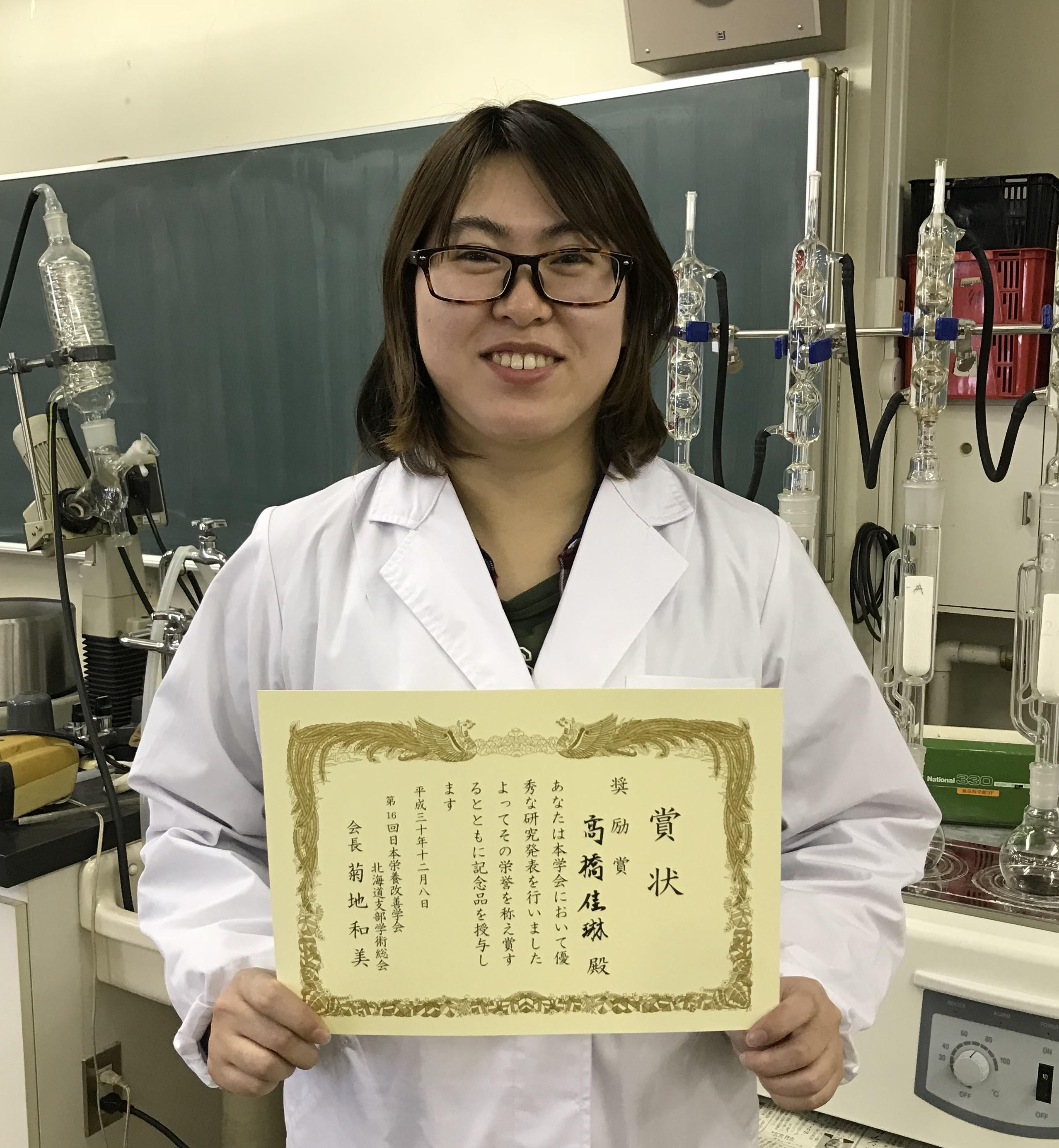 2018年12月8日に札幌コンベンションセンターで開催されました「日本栄養改善学会北海道支部学術総会」において、本学酪農学研究科食品栄養科学専攻修士課程2年の髙橋佳琳さん(指導教員:食品栄養化学研究室 小野寺秀一教授、上野敬司准教授)が奨励賞を受賞しました。