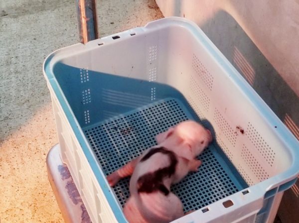 分娩の一連の流れとなる出産前の母豚の動きや、出産後の子豚への対応などを体験することが目的です。お産が始まると、素早い対応が動物看護師には求められます。取り上げた新生児は直ぐに体を拭いて自立呼吸を促したり、体温調整が出来ないため寒さに気を配ります。初めて体験する豚のお産に戸惑っている学生へ「早く拭きなさい、子豚がカゼをひく」と菅野教授から厳しい指導がありました。この日は10頭のお産介助を体験。生産動物の出産現場を学ぶよい機会となりました。