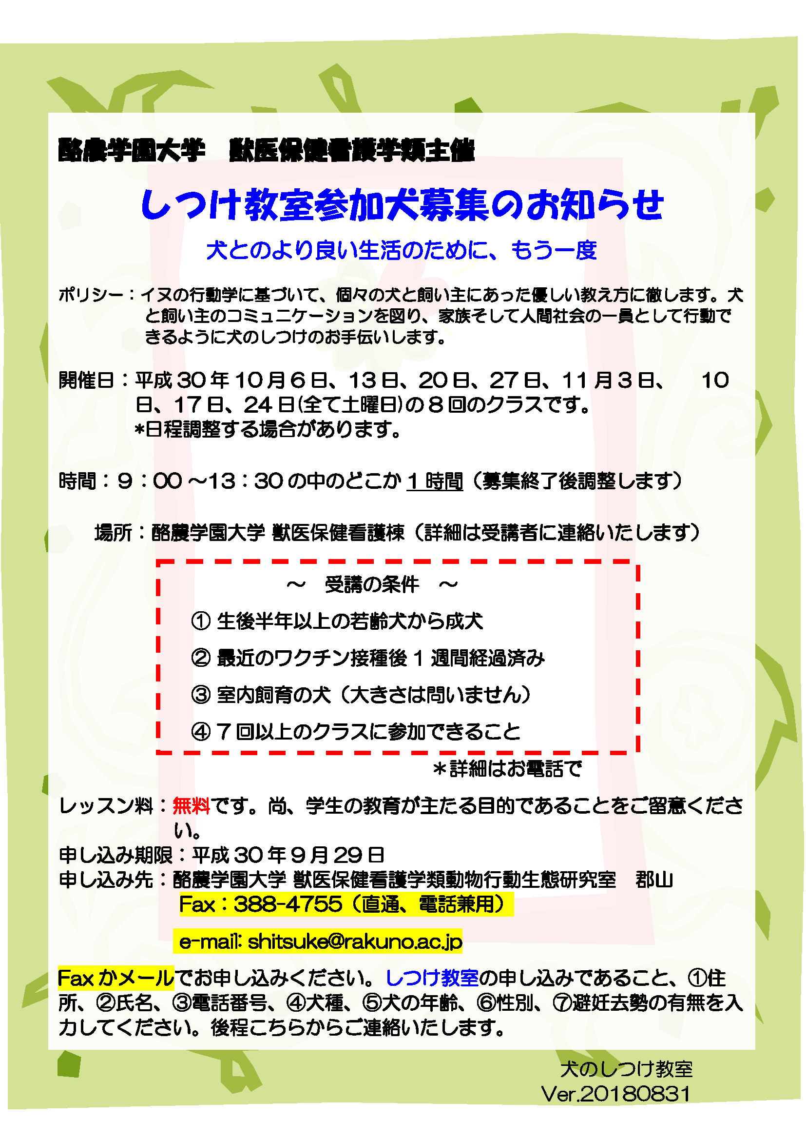 ◆レッスン料 | 無料です。尚、学生の教育が主たる目的であることをご留意ください。 | ◆申し込み期限 | 2018年9月29日(土) | ◆申し込み先 | 酪農学園大学 獣医保健看護学類動物行動生態研究室 郡山 Fax:388-4755(直通、電話兼用) e-mail: shitsuke@rakuno.ac.jp Faxかメールでお申し込みください。しつけ教室の申し込みであること、①住所、②氏名、③電話番号、④犬種、⑤犬の年齢、⑥性別、⑦避妊去勢の有無を入力してください。後程こちらからご連絡いたします。 |