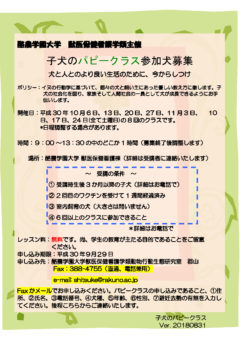 本学獣医保健看護学類主催による、犬のしつけ教室「子犬のパピークラス」の参加犬を、下記の通り募集いたします。