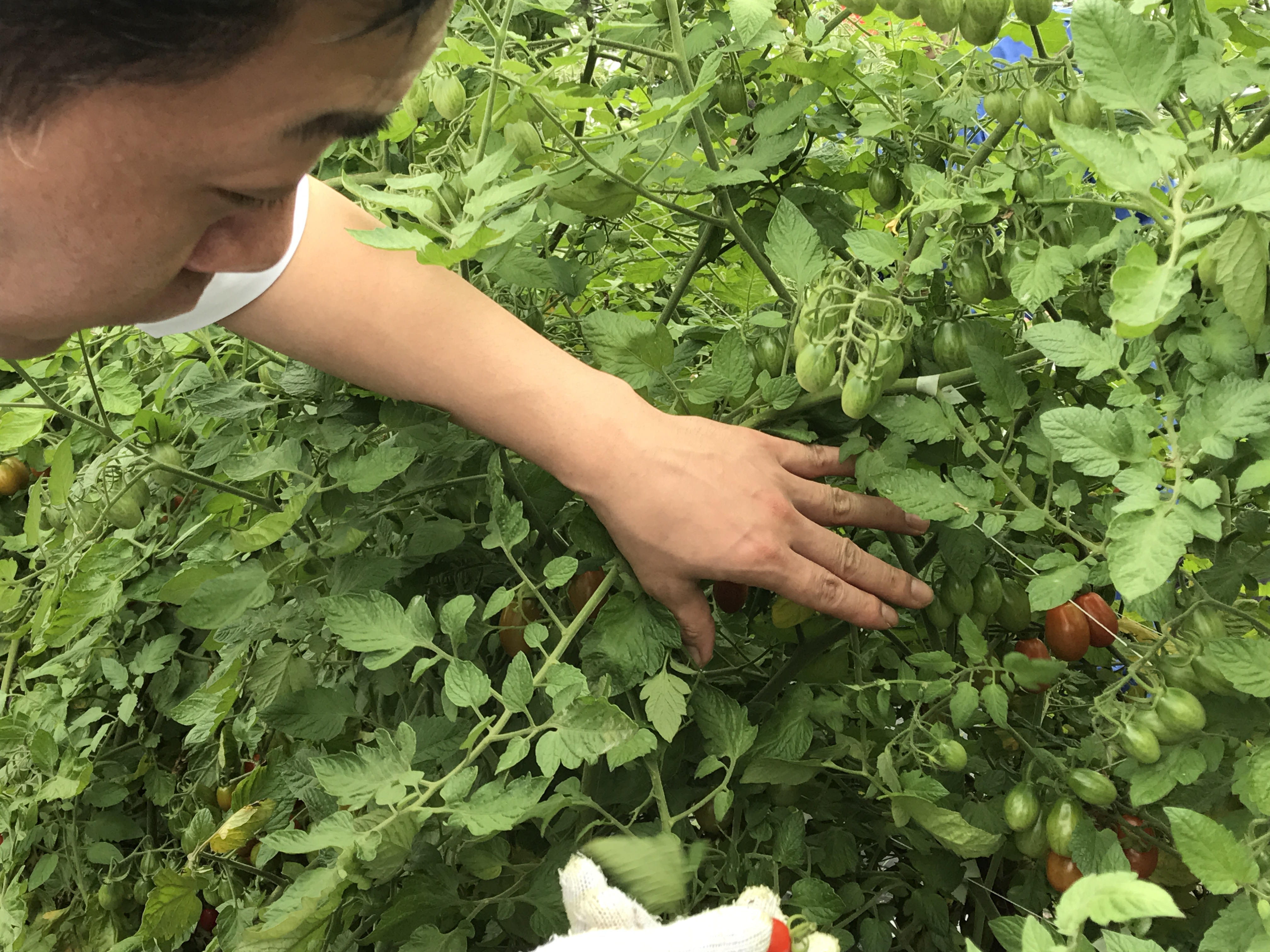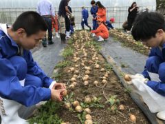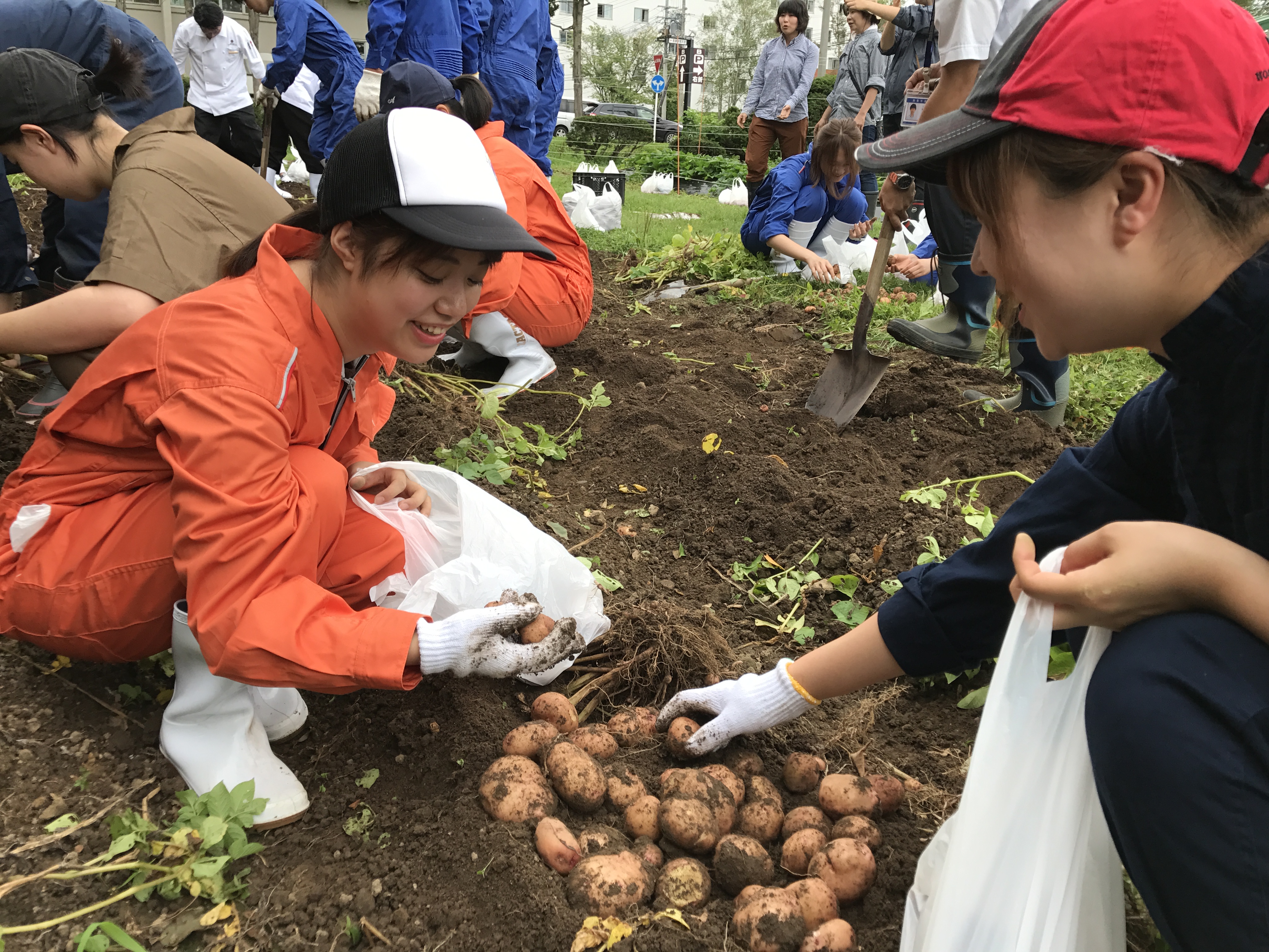 学生たちは、美味しい野菜の見分け方や上手な収穫の仕方を教わりながら、ミニトマト、ジャガイモ、トウモロコシ、タマネギを袋いっぱいに収穫しました。
