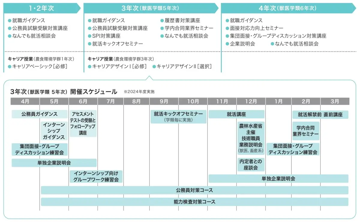 酪農学園大学では、学生一人ひとりが的確な進路や職業の選択を成し遂げられるよう、学生の希望に沿ったキャリア支援を行っています。インターンシップの紹介や就職活動のノウハウを学ぶ「就活講座」をはじめ、公務員試験受験対策、面接対策、ビジネスマナーなど各種講座を開催。農食環境学群では1〜3年生を対象にキャリア授業も開講しています。また、常駐のキャリアアドバイザーが、個別の進路相談のほか、書類添削や面接練習まで多角的にサポートしています。