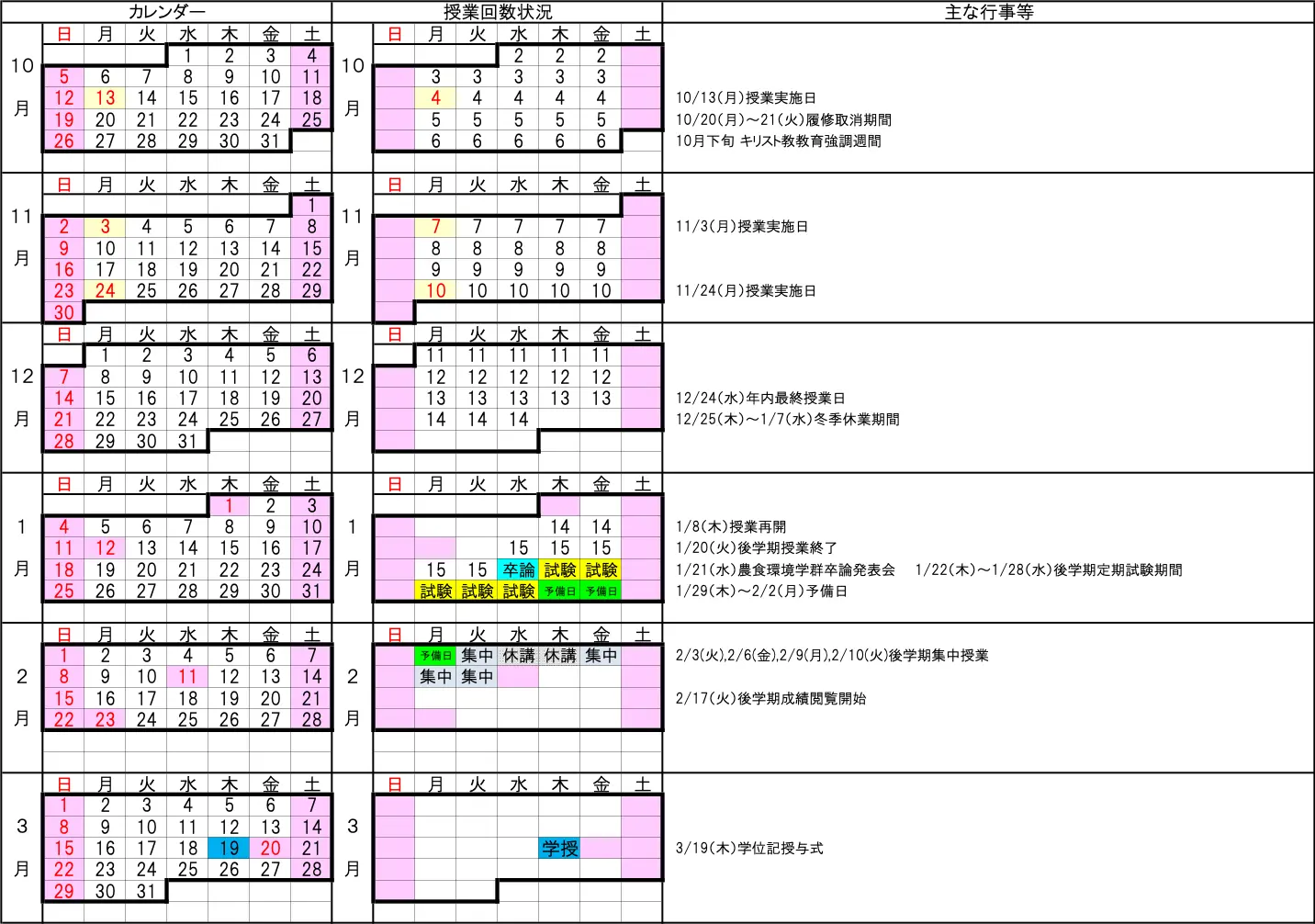 2025年度学事暦 前学期授業期間(4月14日~8月8日) ■ 休業日 ■ 定期試験日 ■ 予備日 ■ 授業実施日 ■ 入学式・学位記授与式 ■ オリ・ガイダンス ■ 集中授業 ■ 休講日 後学期授業期間(9月22日~2月2日) ■ 休業日 ■ 定期試験日 ■ 予備日 ■ 授業実施日 ■ 入学式・学位記授与式 ■ オリ・ガイダンス ■ 集中授業 ■ 休講日 2025年度PDFダウンロード 過去の学事暦 2024年度PDFダウンロード 2023年度PDFダウンロード 2022年度PDFダウンロード 2021年度PDFダウンロード