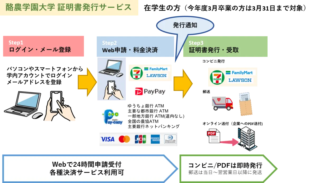 在学証明書・成績証明書・卒業(修了)見込証明書・健康診断証明書 の各種証明書(和文)について全国のコンビニエンスストアでの発行、郵送、電子証明書(PDF)のオンライン送付が可能です。