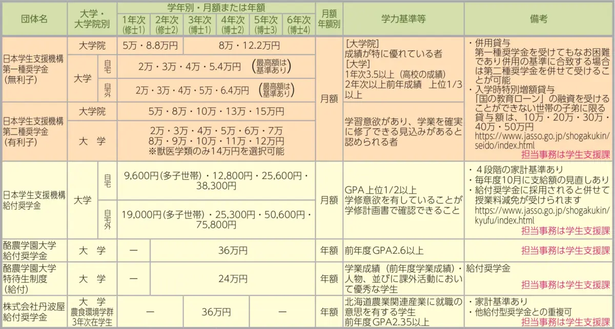 家計支持者(父母、又は父母に代わって家計を支えている者)の失業、破産、事故、病気もしくは死亡等又は火災、風水害の災害等により家計が急変し、奨学金を緊急に必要とする場合は、学生支援課に相談に来てください。事情により定められた応募期間のほかに、日本学生支援機構の緊急・応急採用や酪農学園大学奨学金を申請できる場合があります。