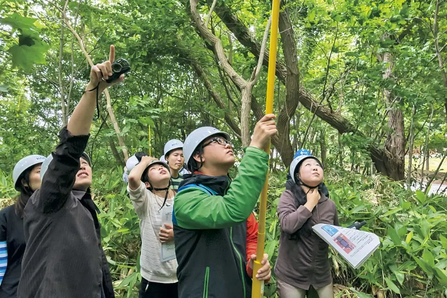キャンパス内の樹木の大きさを1本ずつ調べ、木の成長量とそれに伴う二酸化炭素の吸収量を記録しています。