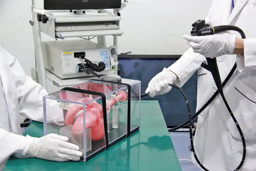 臓器のモデルを使用して、実際に内視鏡の操作を学びます。